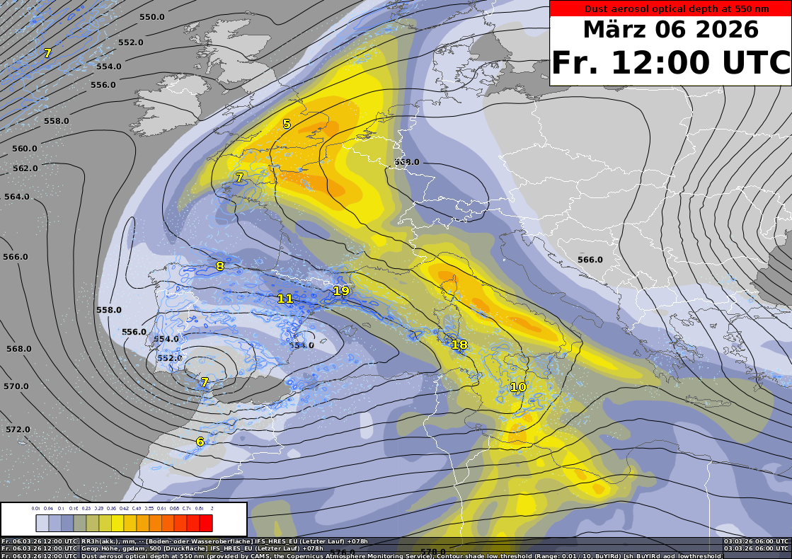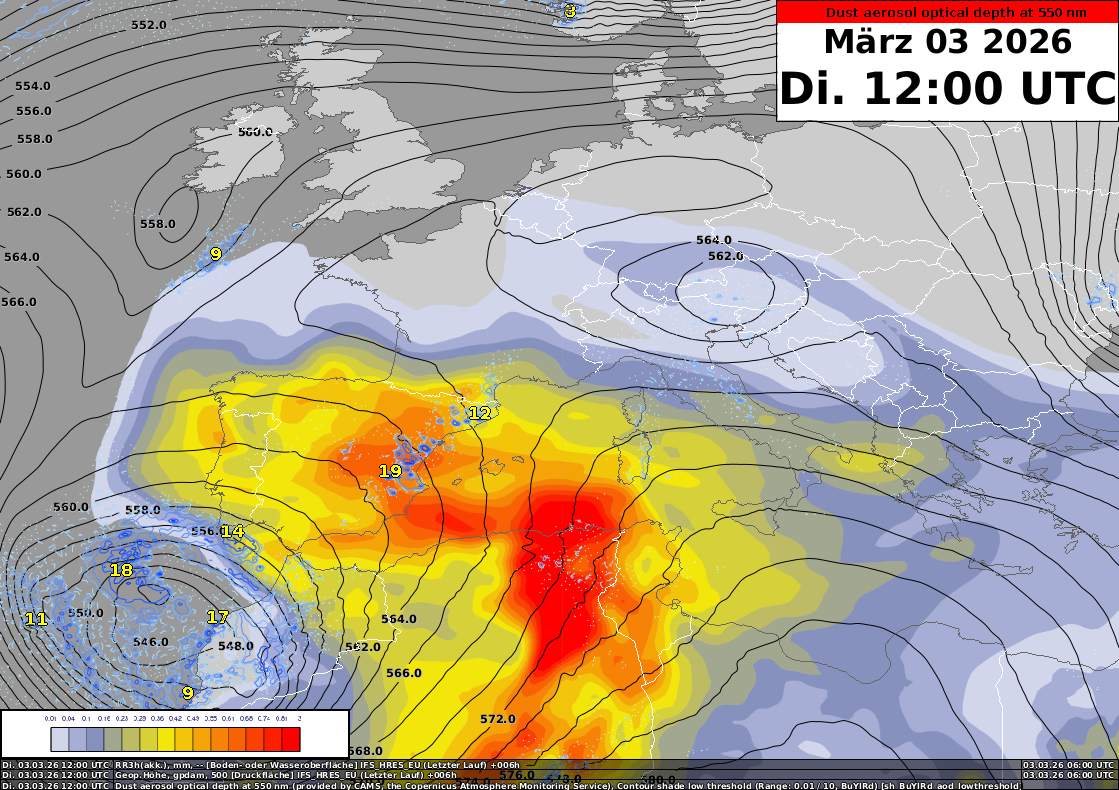 Dienstag, 3. März, 12 UTC: Die farbigen Flächen stellen die berechnete Staubkonzentration des speziellen Modells von Copernicus dar. Die schwarzen Linien zeigen die Isohypsen auf 500 hPa des IFS Modells. Quelle: Copernicus, ECMWF, MeteoSchweiz