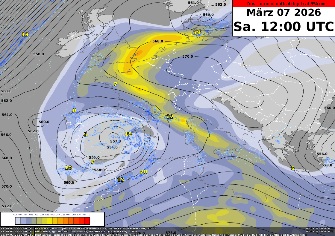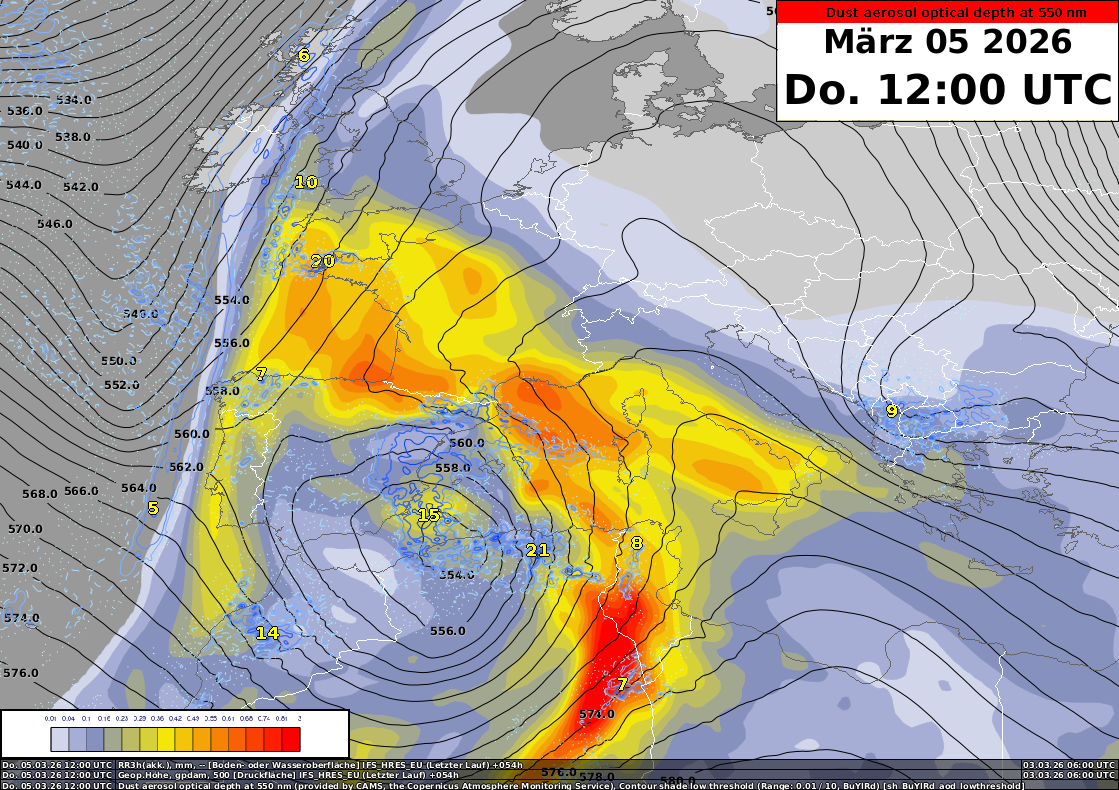 Damit diese Verfrachtung möglich ist, müssen verschiedene Prozesse zusammenspielen. Zunächst braucht es in der Sahara genügend Wind, damit der Mineralstaub vom Boden in die Luft gewirbelt wird. Das kann einerseits durch Konvektion, andererseits durch Fronten ausgelöst werden. Für den Weitertransport zum Alpenraum sind Tiefdruckgebiete mit Fronten gut geeignet, weil sich auf der Vorderseite auch gleich eine südwestliche Höhenströmung einstellt. Anfang Woche zog das kräftige Tief «Regina» vom Atlantik nach Marokko und führte bereits zu Staubtransport in den westlichen Mittelmeerraum. Die folgende Grafik zeigt die Staubkonzentration in Kombination mit den Druckverhältnissen in der Höhe. Diese Berechnungen stammen von einem Modell, das auf Staub in der Atmosphäre spezialisiert ist.