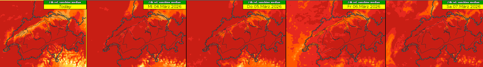 Tägliche Sonnenscheindauer von Dienstag (Today), 3. März bis Samstag, 7. März 2026: Je roter, desto sonniger. Gut zu erkennen ist die reduzierte Sonneneinstrahlung durch Quellwolken im Süden und Morgennebel im Mittelland, jedoch noch kaum durch die möglicherweise mit Saharastaub dichteren Wolkenfeldern am Donnerstag und vor allem am Freitag. Grafik: MeteoSchweiz
