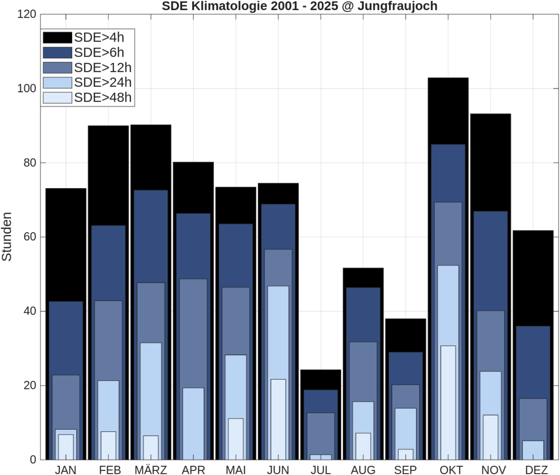 Stunden mit Saharastaub Messung auf dem Jungfraujoch im Jahresverlauf. Grafik: MeteoSchweiz